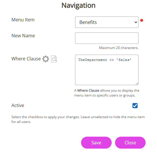 Leave Active deselected to hide the menu item from all employees' systems immediately.