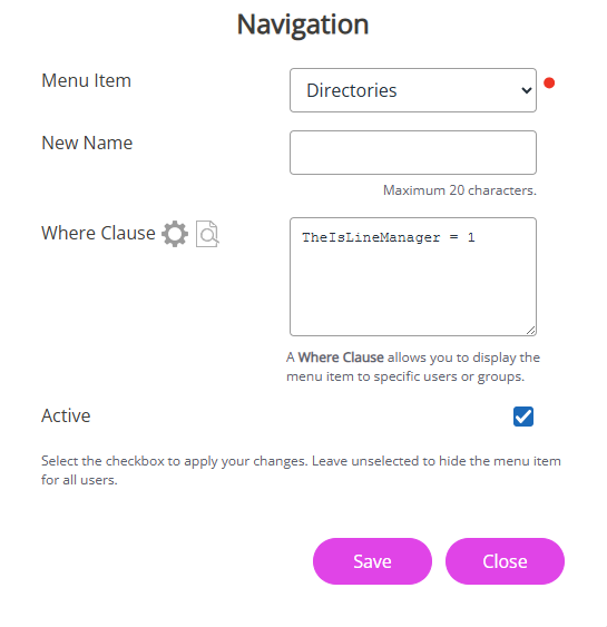 The menu item will now only be visible to the employees included in the Where Clause. If you only wanted to show the menu item to an individual employee, add a Where Clause specific to them, such as their employee number.