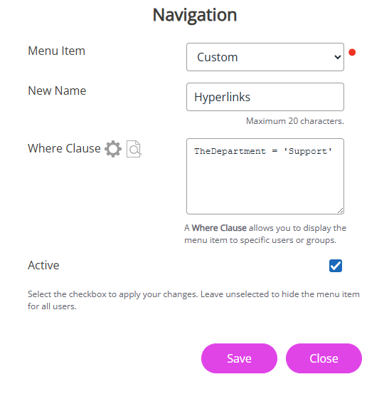 For example, if you only want to rename the Custom menu to Hyperlinks for employees in the Support department, from Field, choose Contract - Department, from Operator, choose Equal to, and from Value, choose Support.